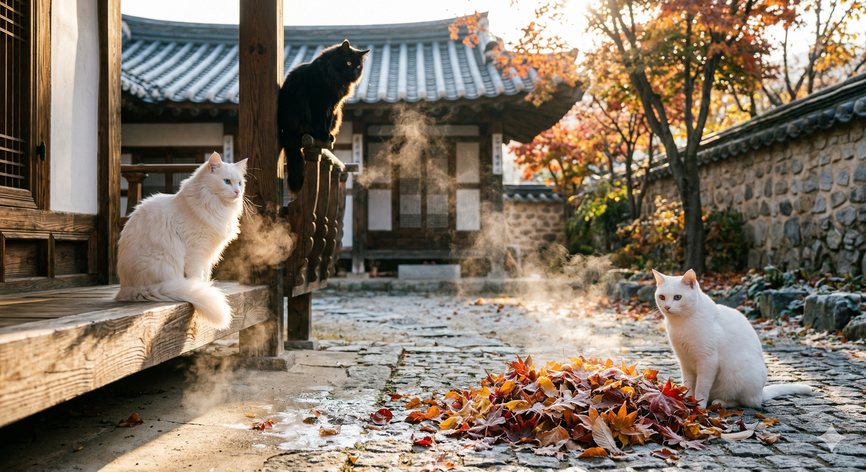 #언리얼엔진5 #UE5 #3D애니메이션 #한옥마당 #서리기화 #아침햇살 #수증기 #역광산란 #고양이삼남매 #루나라온다온