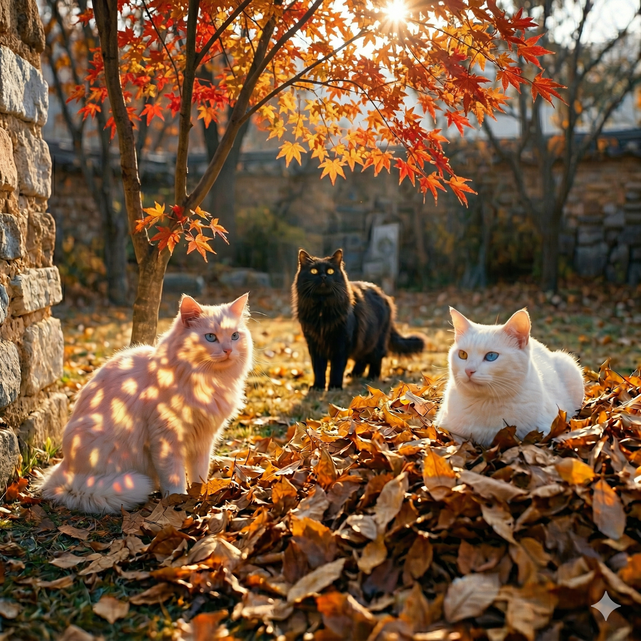 라온 — 검은 장모, 황금 눈 라온은 마당 중앙에서 단풍나무 전체를 시야에 담으며