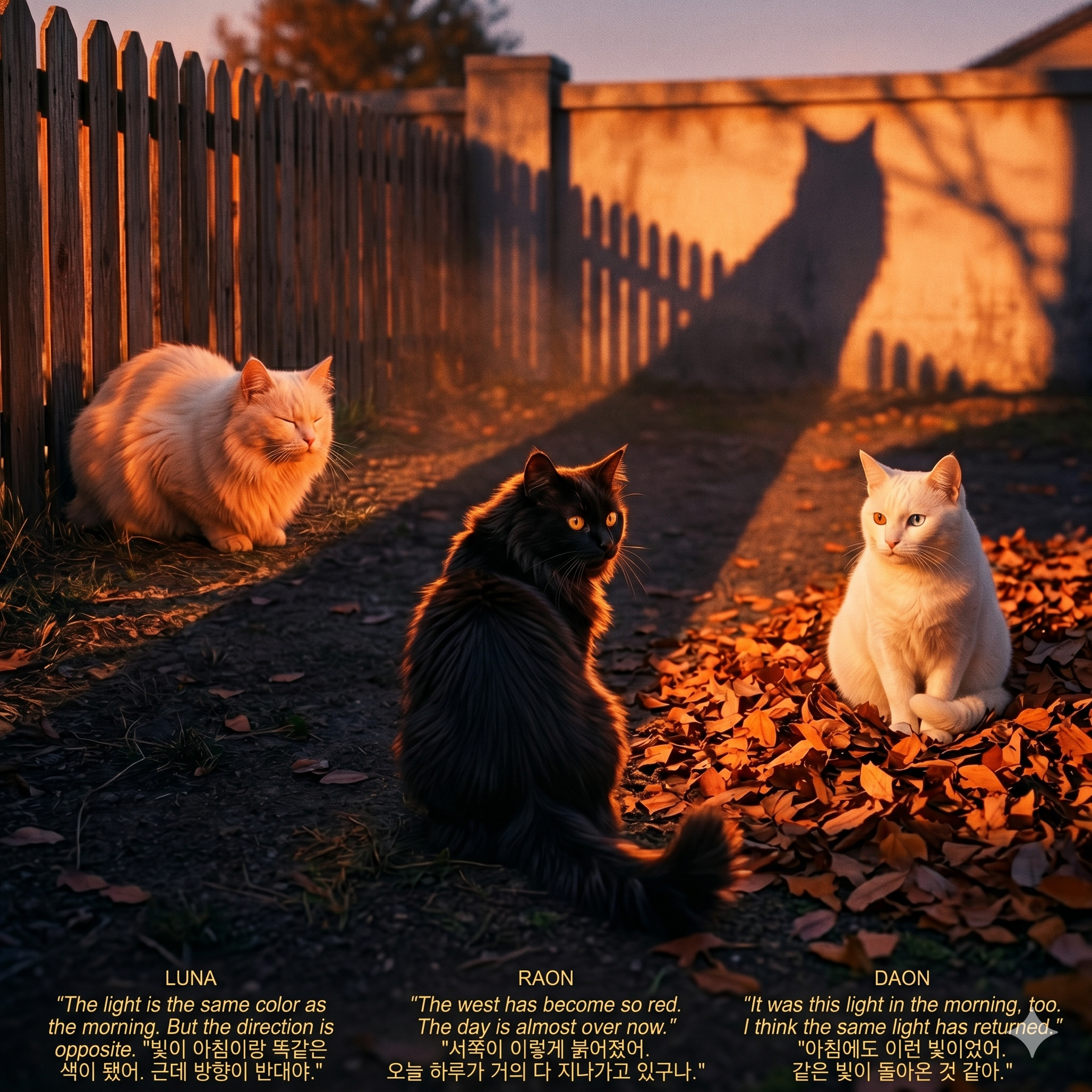 라온은 마당 중앙에서 석양 오렌지광이 검은 장모 끝단에 강렬한 림라이트를 형성하는 것을 느끼며 서쪽을 바라보았다.