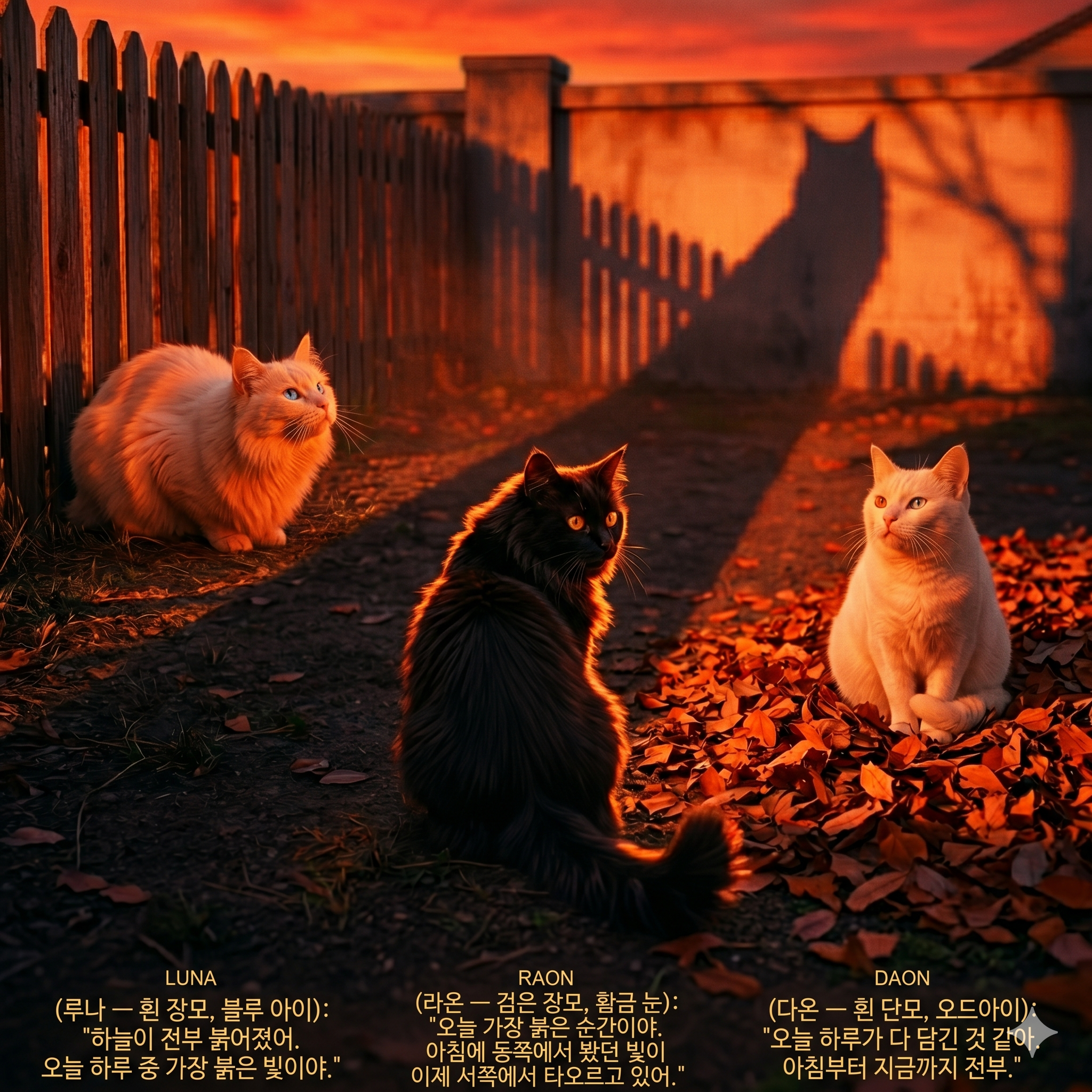 루나는 마당 가장자리에서 석양 절정의 붉은 오렌지광이 흰 장모 전체를 깊게 물들이는 것을 느끼며 서쪽 하늘을 바라보았다.