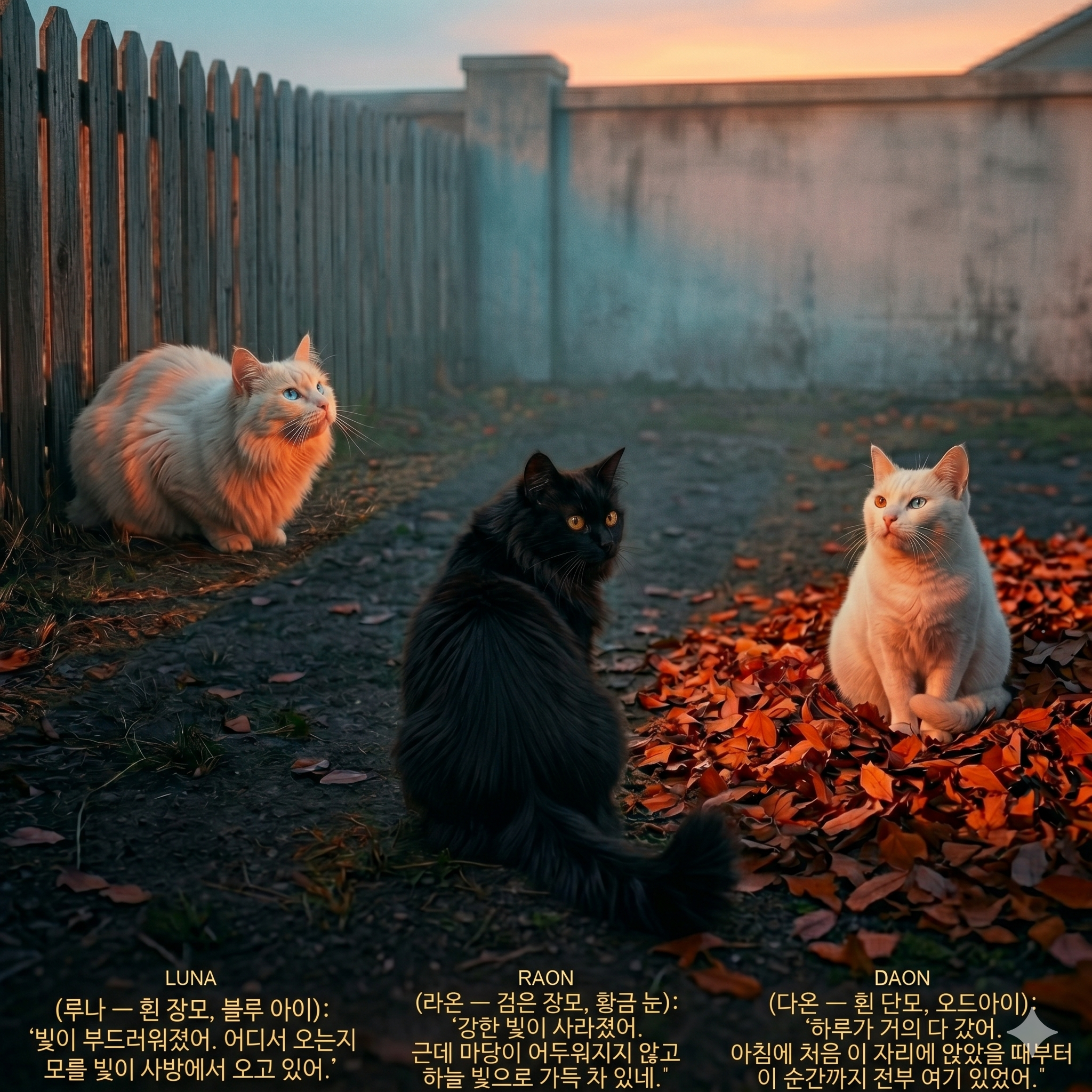 루나는 마당 가장자리에서 직사광이 사라진 황혼의 부드럽고 확산된 빛 안에서 몸을 낮추고 마당 전체를 바라보았다.