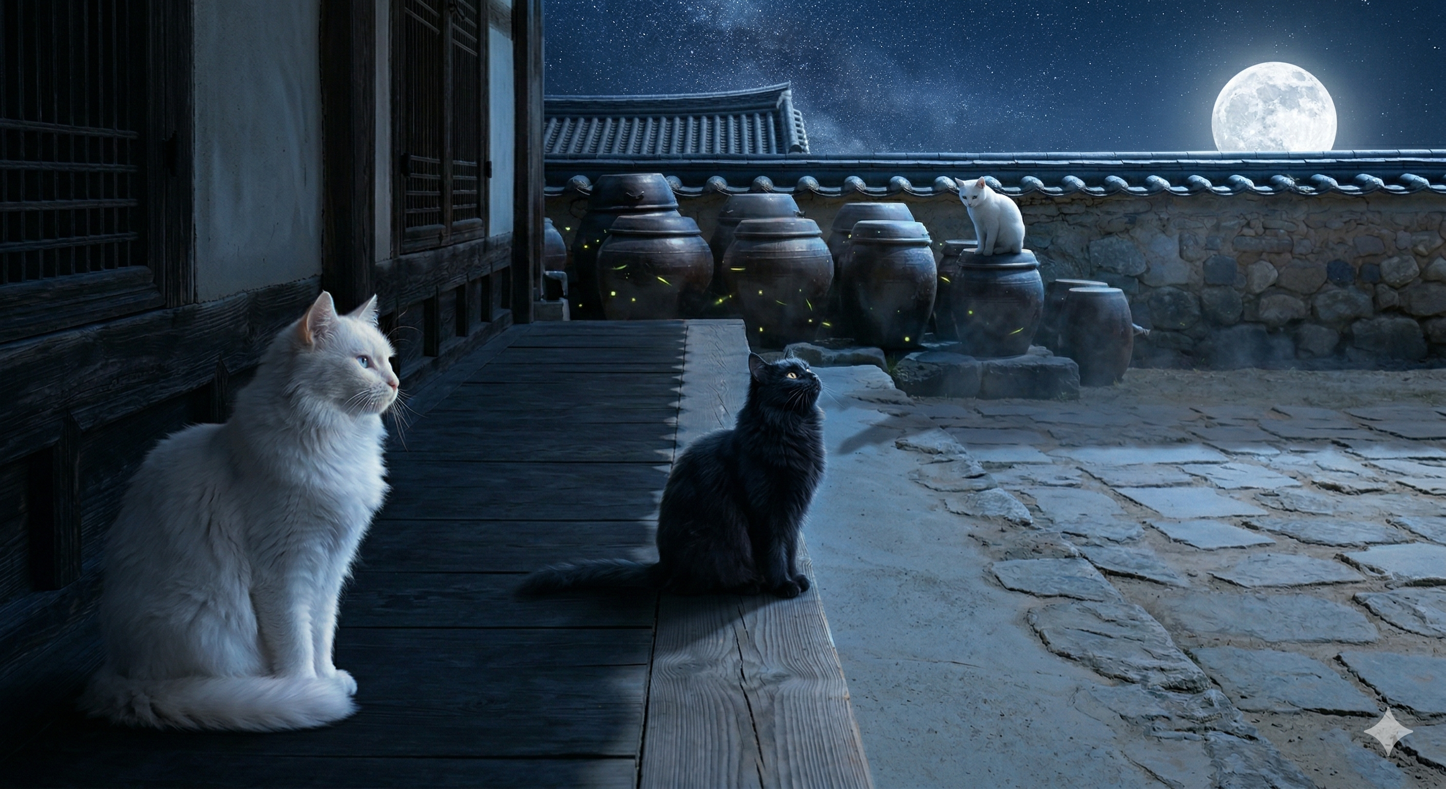 장독대 위에 올라앉아 달빛이 만들어내는 그림자 패턴을 오드아이로 조용히 관찰합니다.