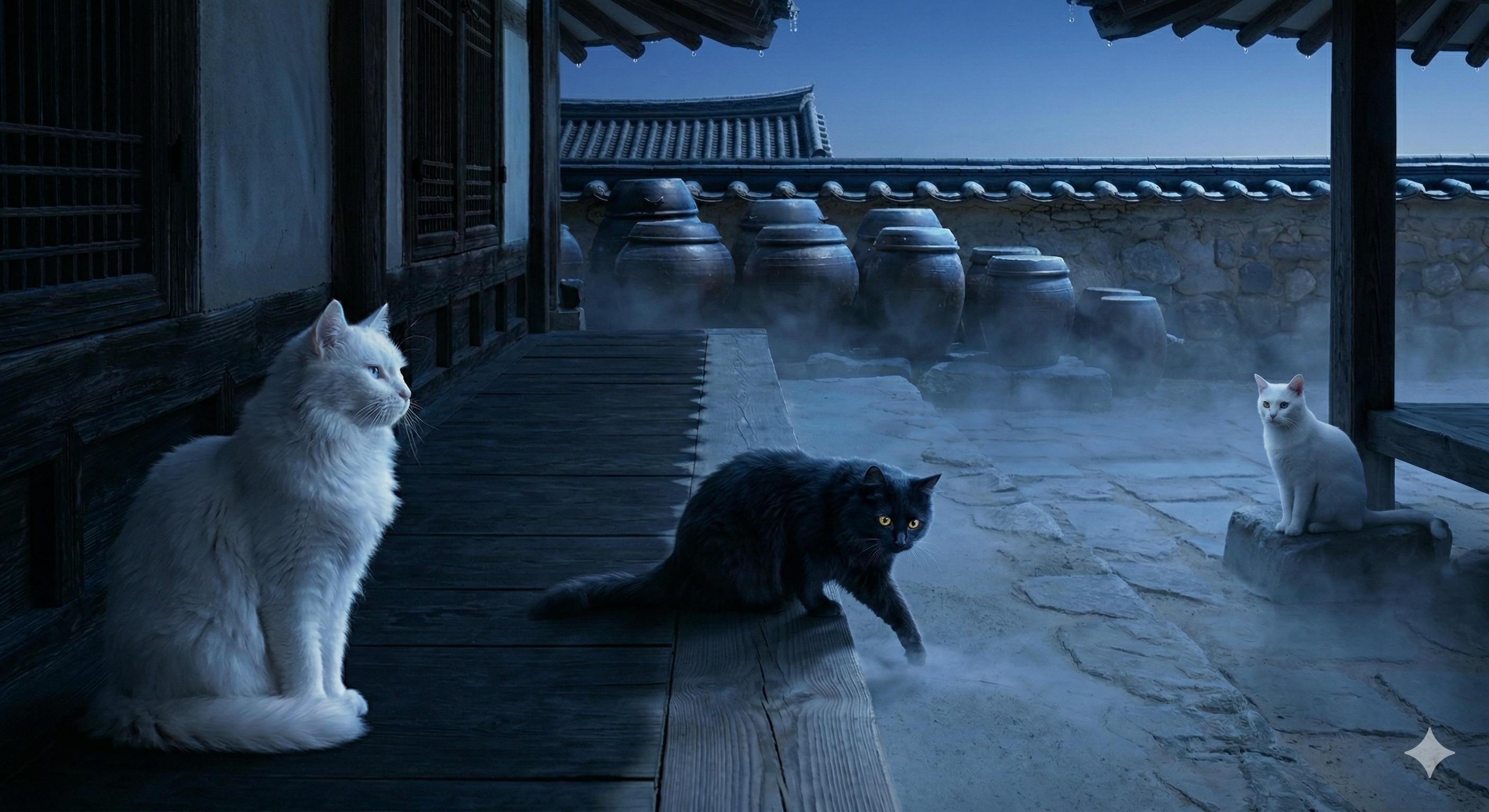 마당 전체가 하루 중 가장 조용하고 서늘한 공기로 가득 찹니다. 세 고양이는 저마다의 방식으로 이 새벽을 맞이합니다.