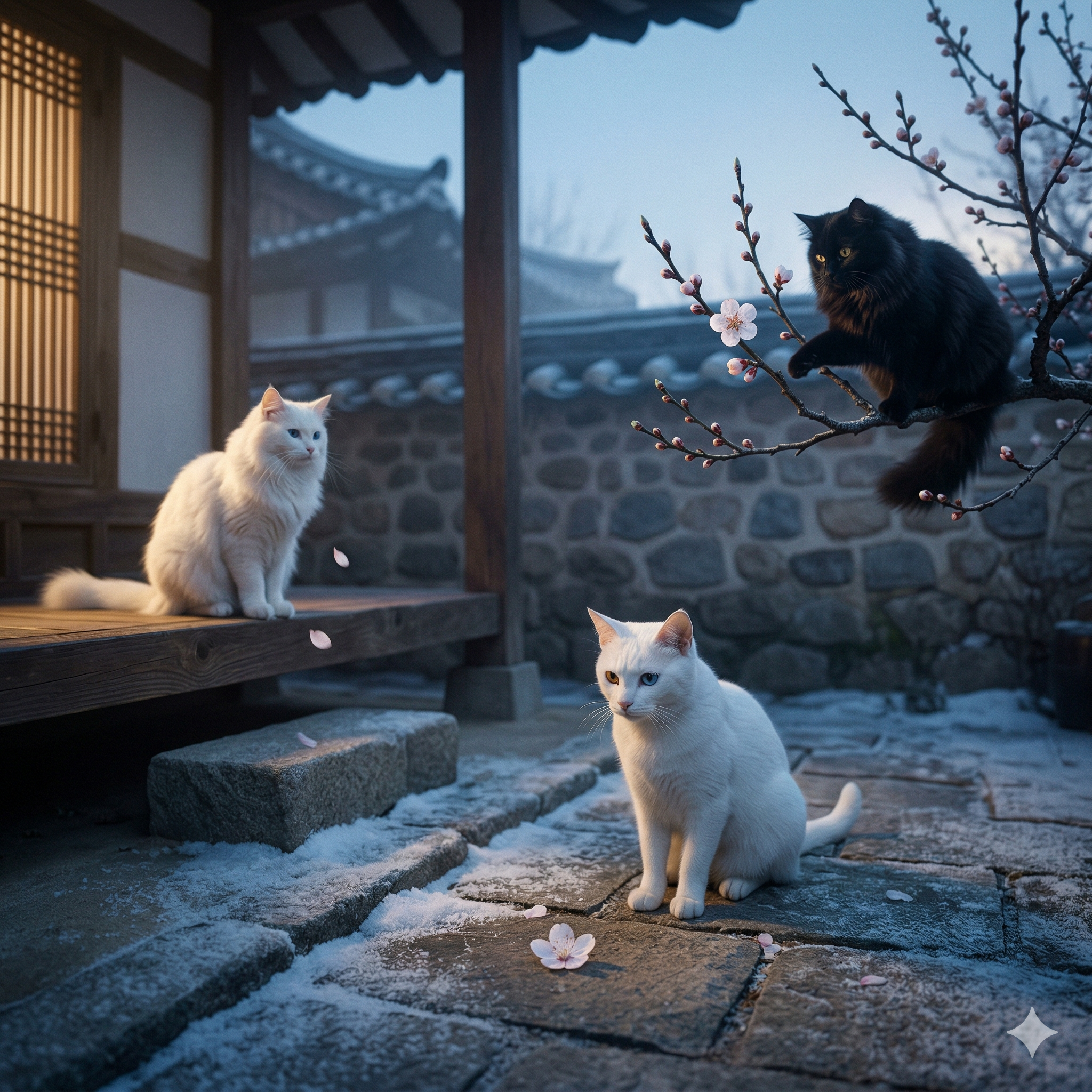 — 겨울이 완전히 가지 않았지만, 봄이 이미 와 있는 그 경계의 아침을 세 고양이가 처음으로 맞이하는 한옥 마당"— 고양이 삼남매의 매화 피는 이른 봄 새벽 장면을 매화 낙화 파티클과 봄 여명 라이팅으로 구현한 제작 과정을 공개합니다.