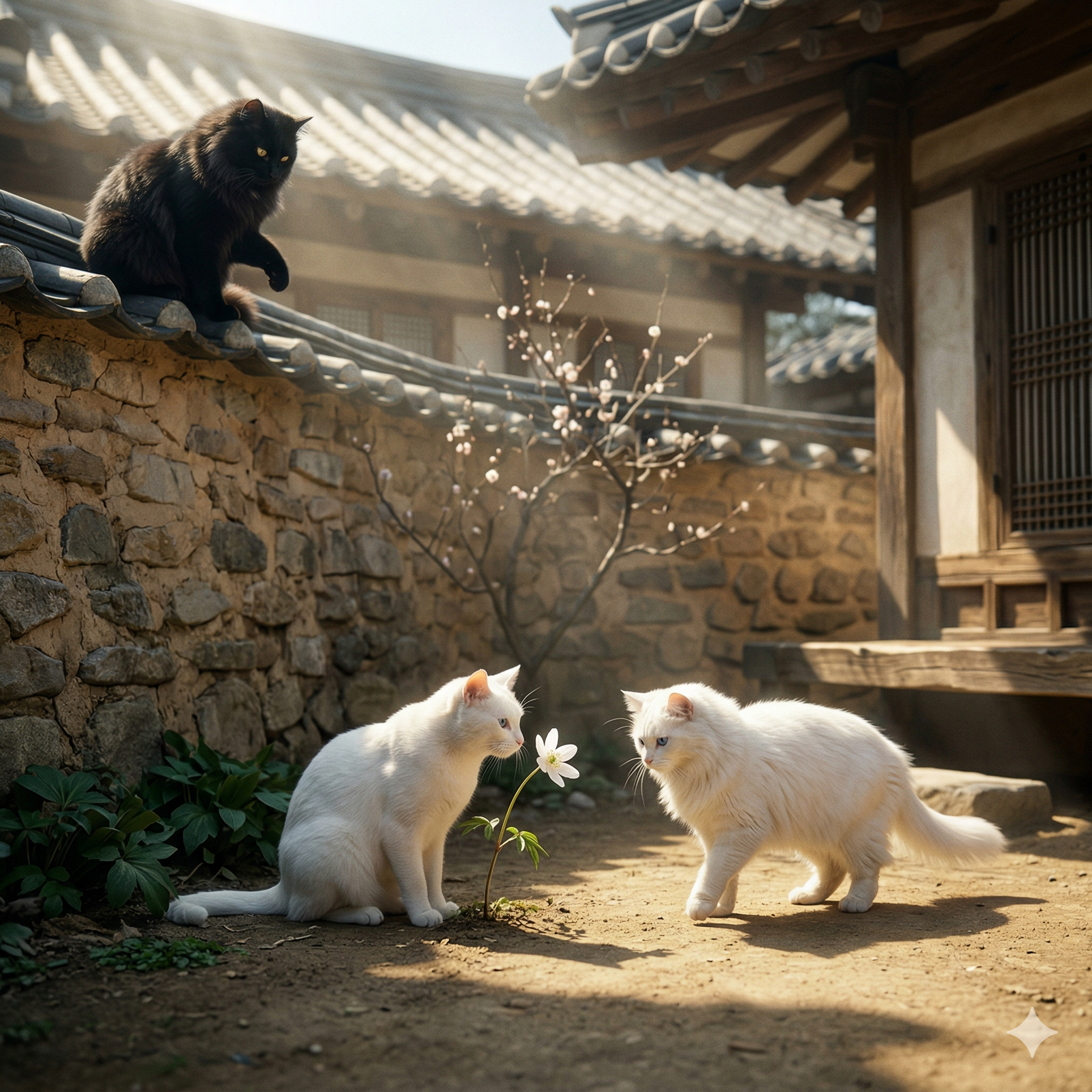 루나가 바람의 방향을 이해하고, 라온이 흔들리는 것은 잡는 게 아니라고 하고, 다온이 꽃이 사는 방식을 조용히 읽어내는 봄 한낮 —한옥 마당의 봄이 드디어 흔들리며 완성되었습니다.