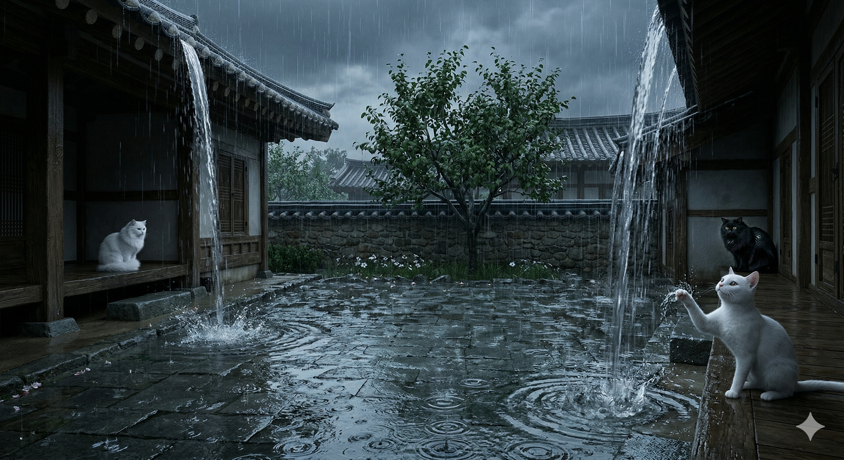 — 루나, 라온, 다온이 처음 맞는 여름 비를 각자의 방식으로 마주하는 여름 소나기의 한옥 마당"