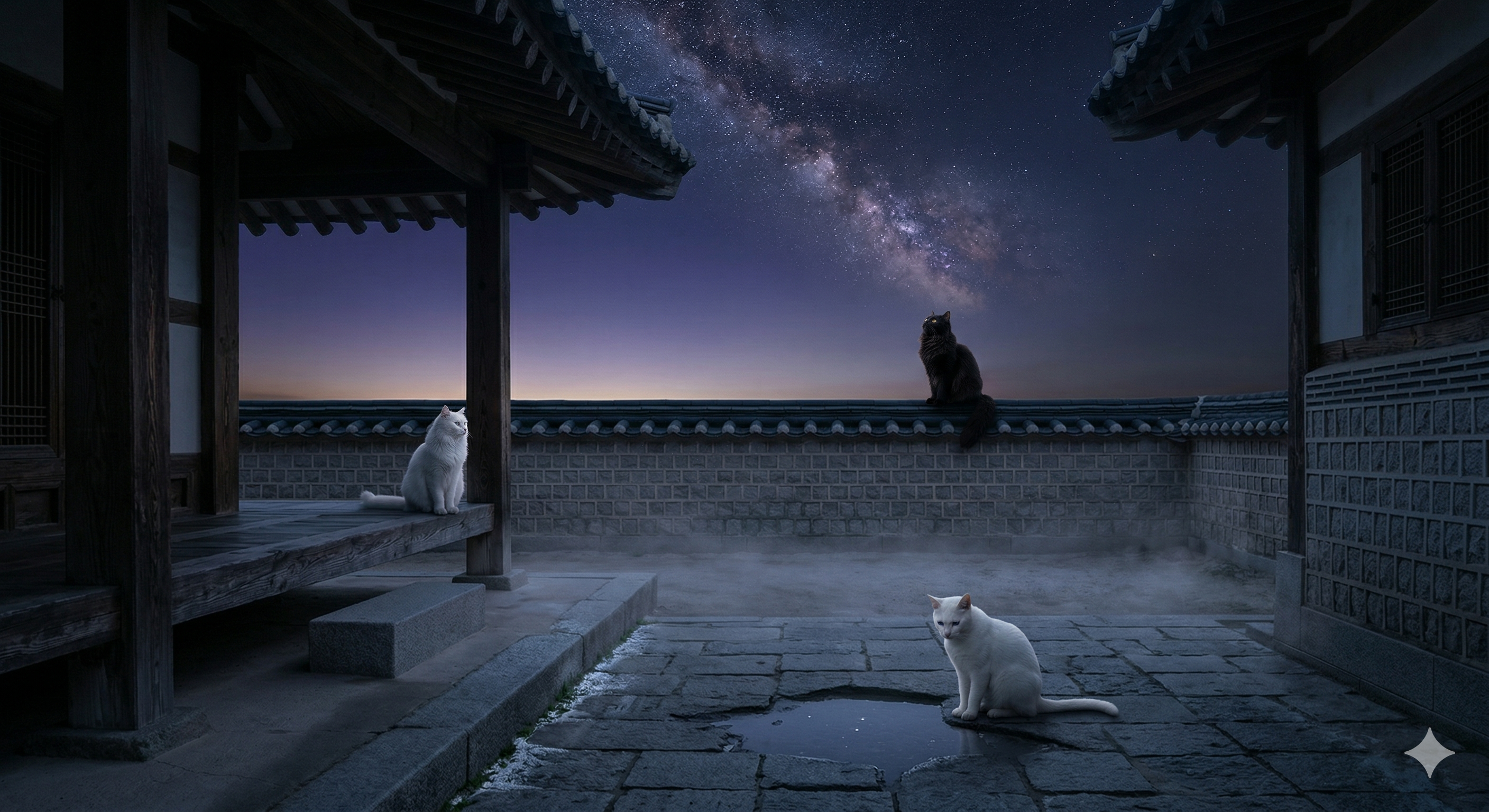 — 루나, 라온, 다온이 별빛의 끝과 여명의 시작이 만나는 한옥 마당의 가장 짧은 순간을 맞이하는 여름 새벽의 첫 장면"