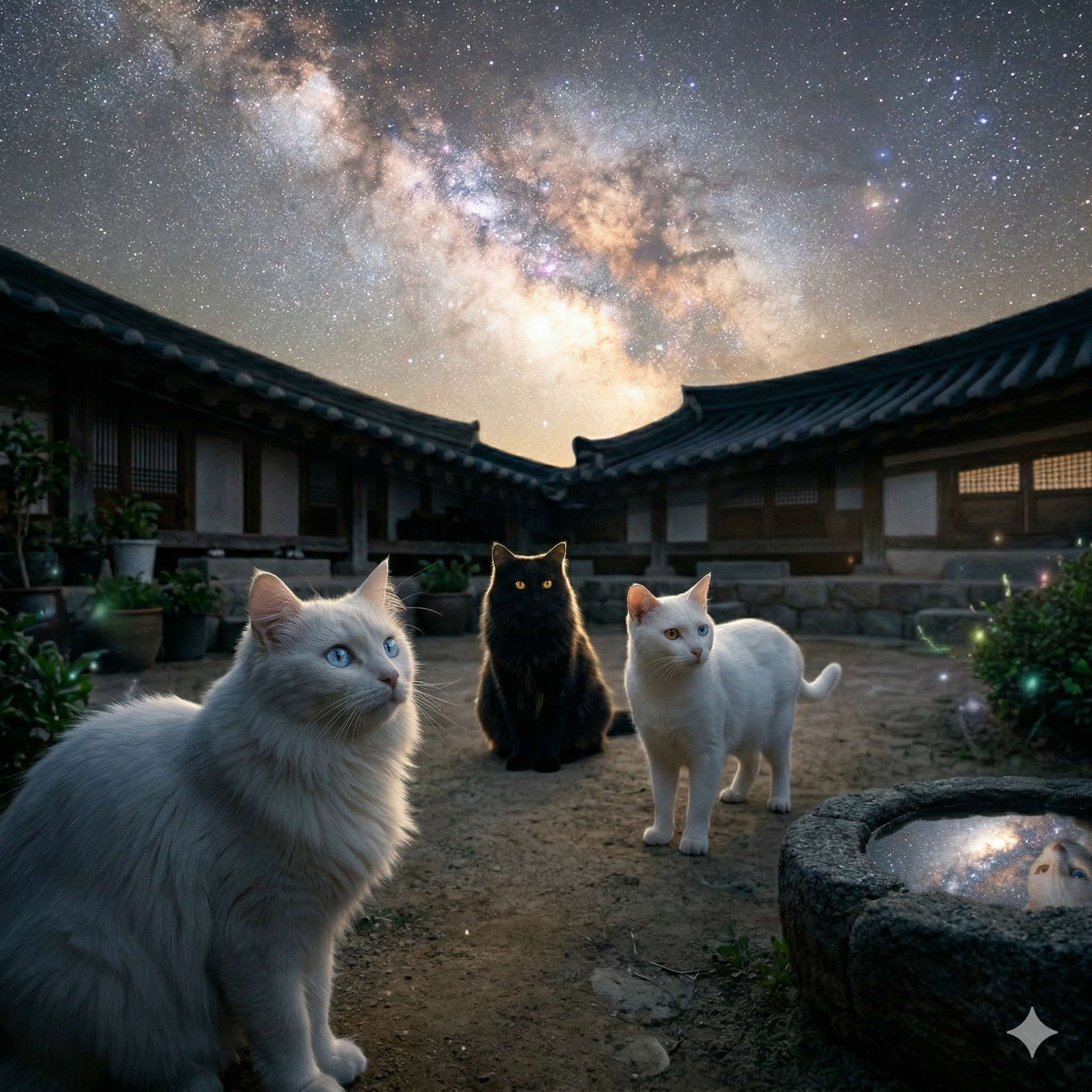 어두운 한옥 마당 안에서 은하수 빛을 등지고 소리의 방향을 찾는 라온 — 검은 장모, 황금 눈, 은하수 림 라이팅의 조합이