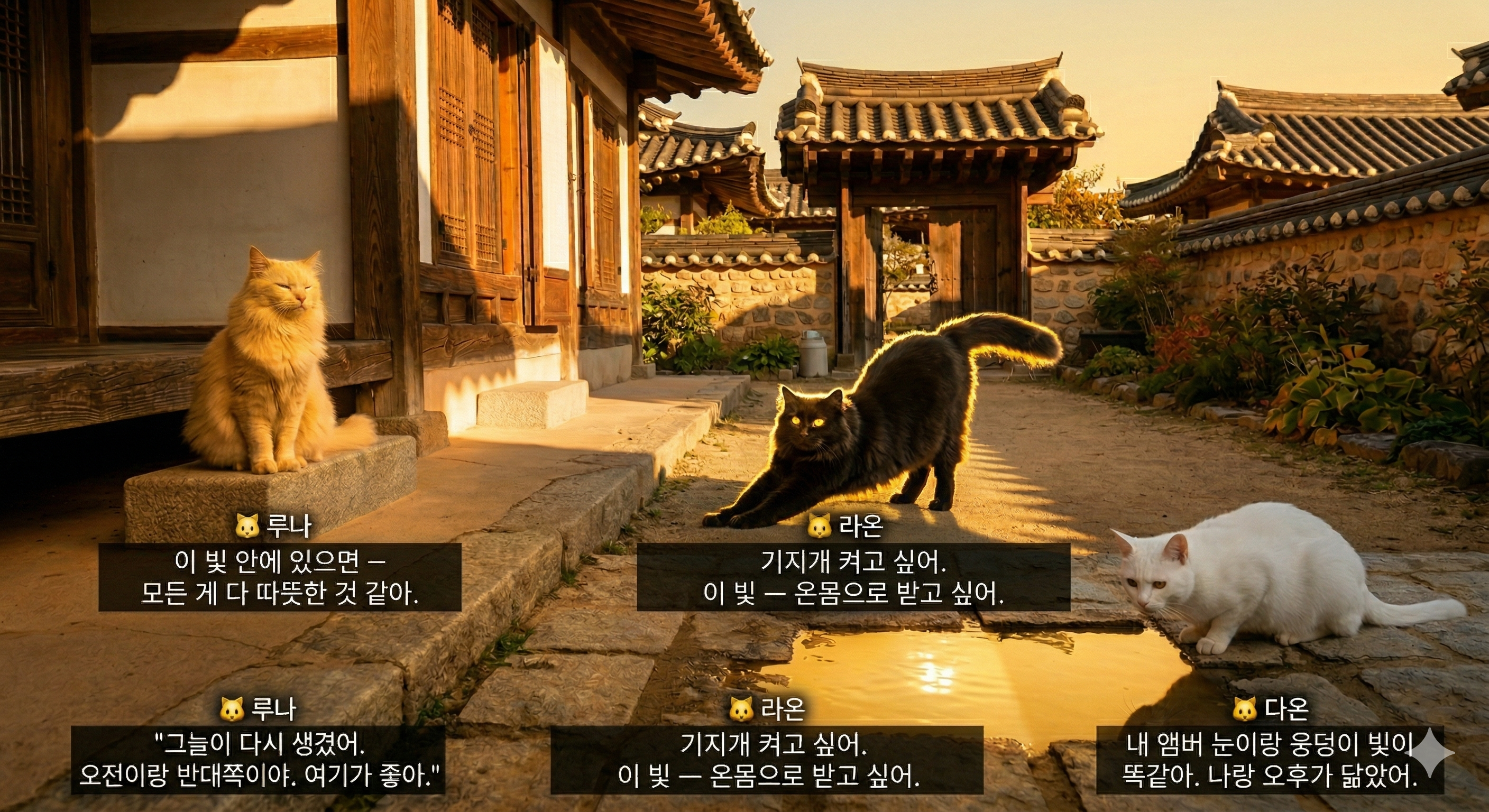 #언리얼엔진5 #UE5 #3D애니메이션 #한옥마당 #황금빛절정 #황금시간대심화 #노을예고 #앰버빛절정 #고양이 #루나라온다온 #ColorBleeding #LumenGI #UnrealEngine5 #HanokCourtyard #GoldenHourPeak #AmberLight #SunsetPreview #3DAnimation #Cats #LunaRaonDaon