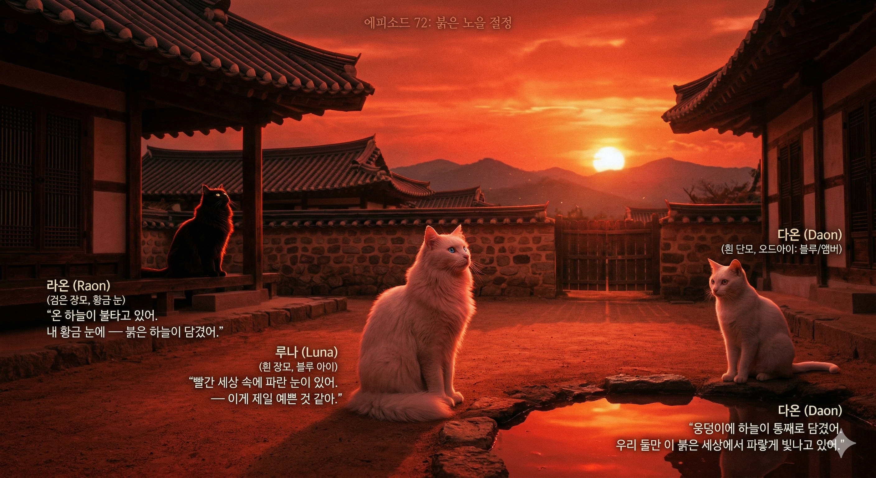 에피소드 72: 저녁노을의 절정 — 한옥 마당이 에피소드 시리즈에서 처음으로 완전히 붉게 타오르는 순간