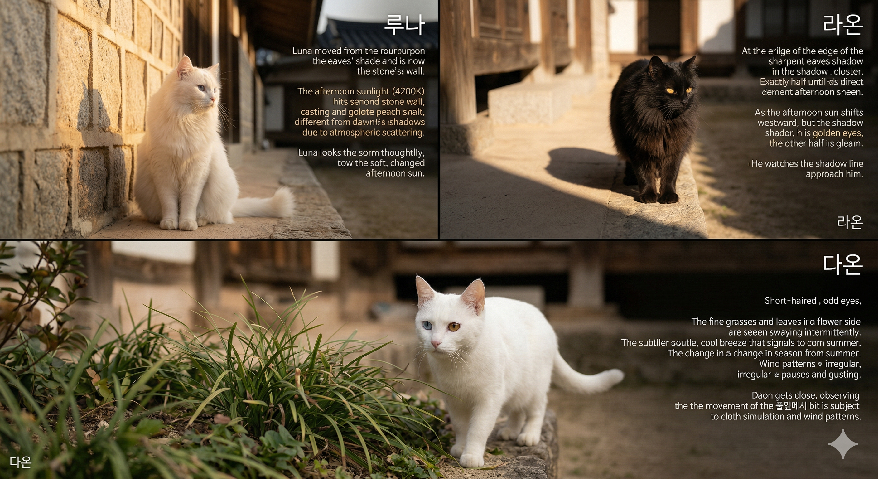#언리얼엔진5 #UE5 #3D애니메이션 #한옥마당 #늦여름오후 #사광 #황금빛 #계절전환 #고양이삼남매 #루나라온다온