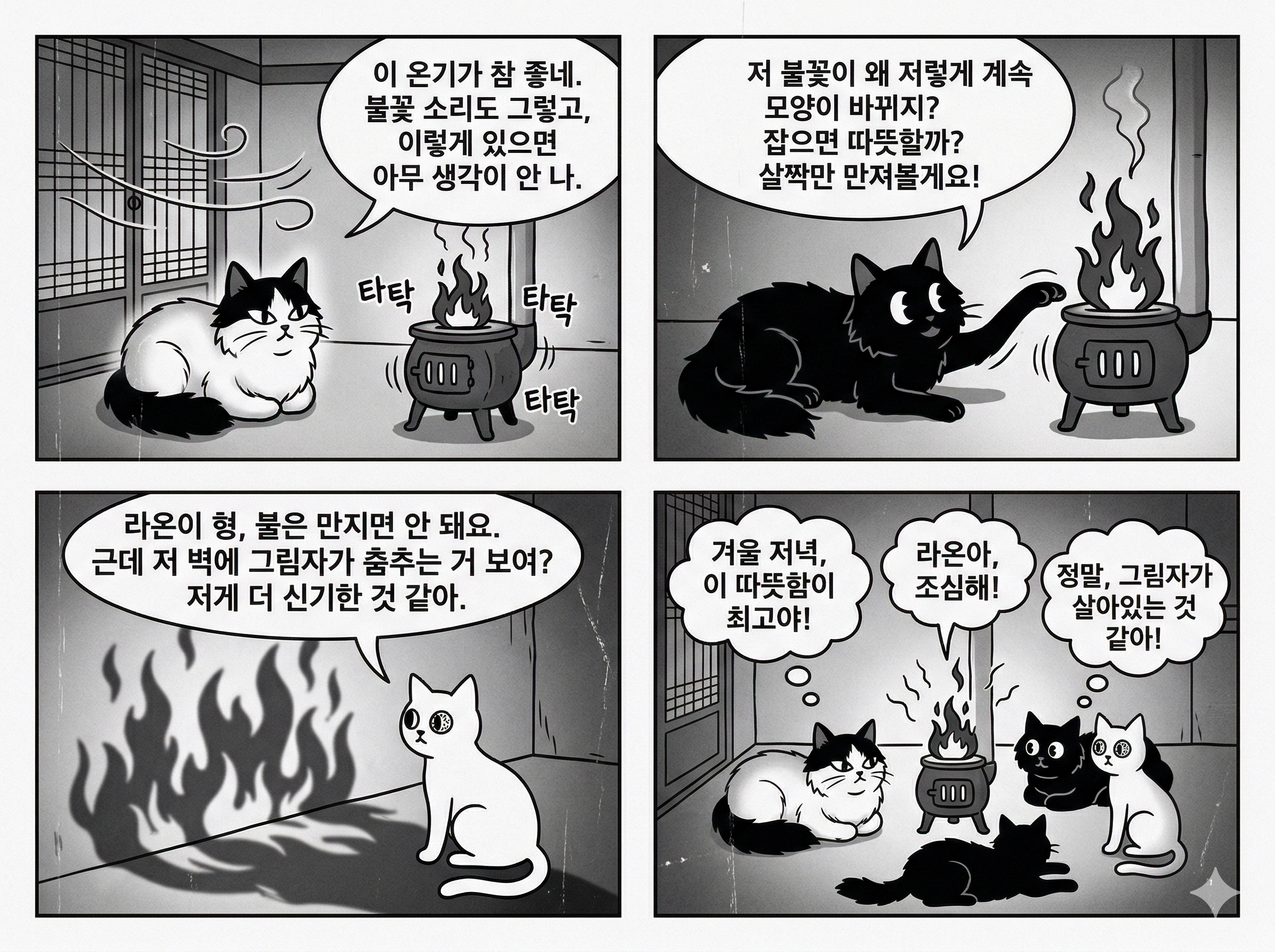 한옥 방 안 난로에 불을 피우고 그 주변에 모여든 루나·라온·다온의 겨울 저녁 장면을 배경으로,