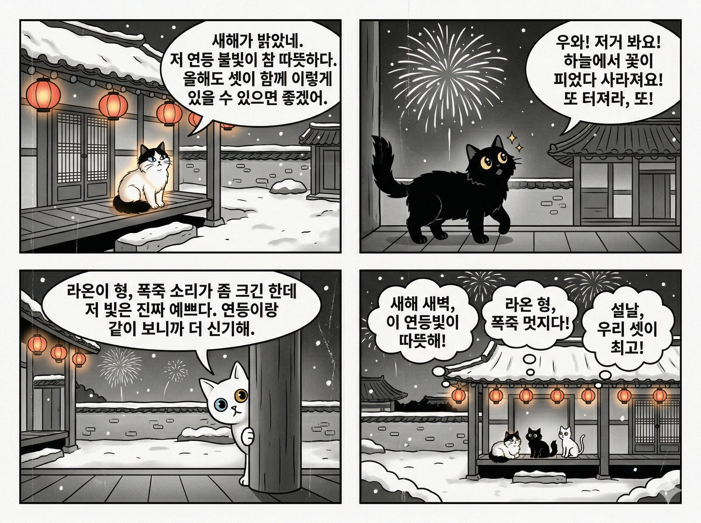 세 고양이는 대청마루에서 이 특별한 새해 첫 밤을 함께 바라봅니다.