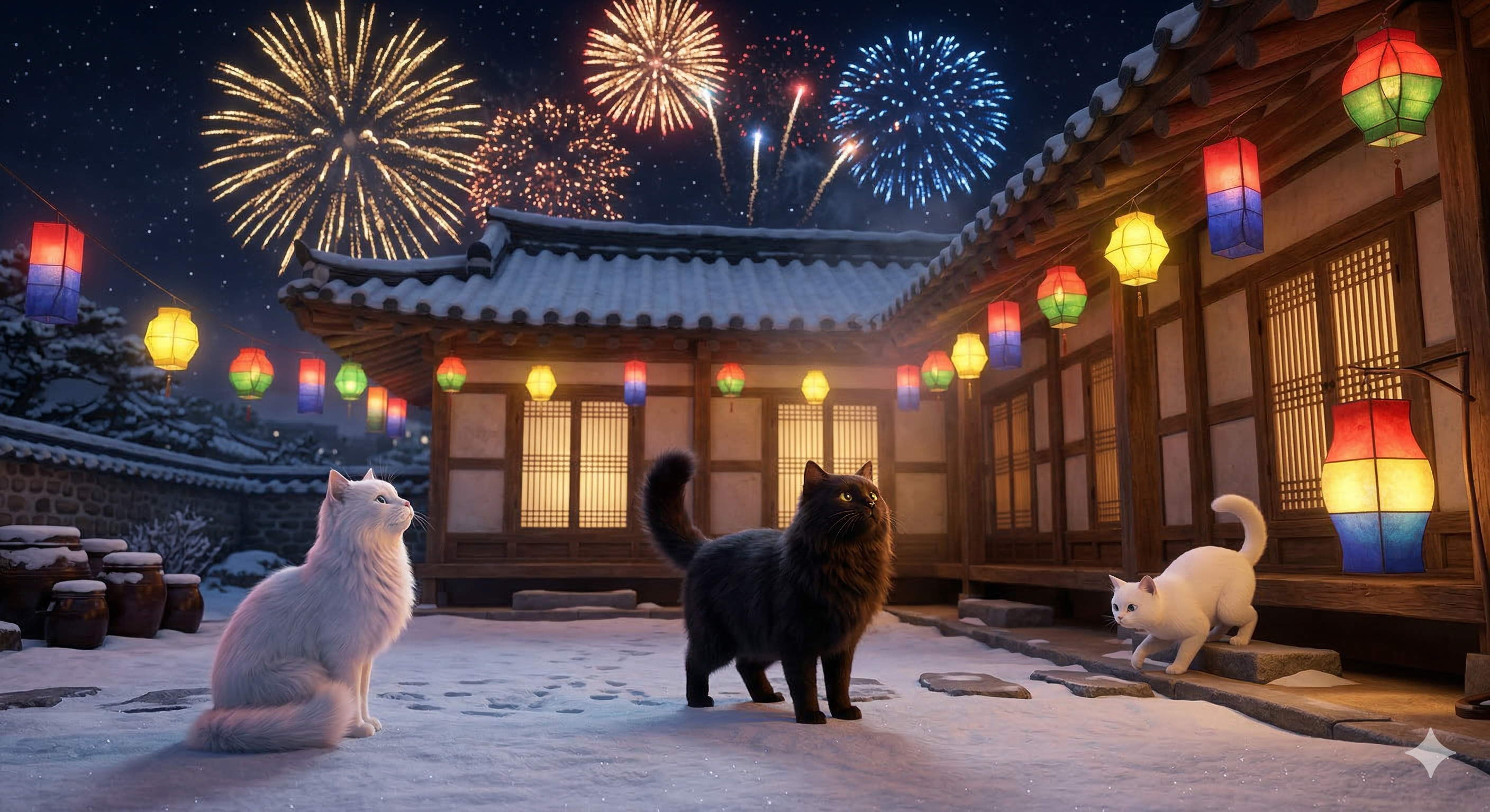 폭죽이 터질 때마다 고양이들의 털과 한옥 처마가 순간적으로 환하게 빛나는 극적인 연출을 완성했습니다.