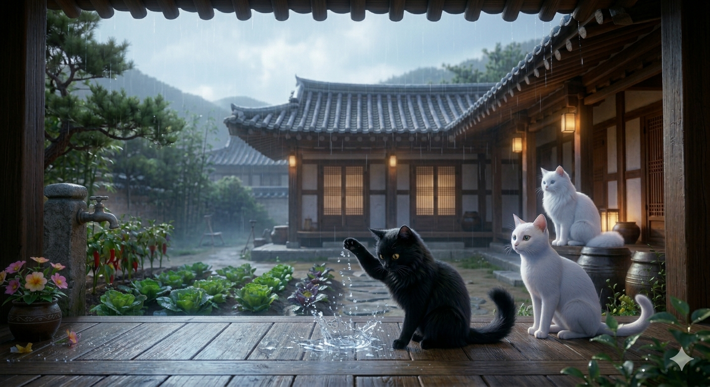 봄비를 맞으며 새싹이 돋아나는 한옥 화단을 배경으로, 루나·라온·다온이 봄비에 반응하는 섬세한 움직임을