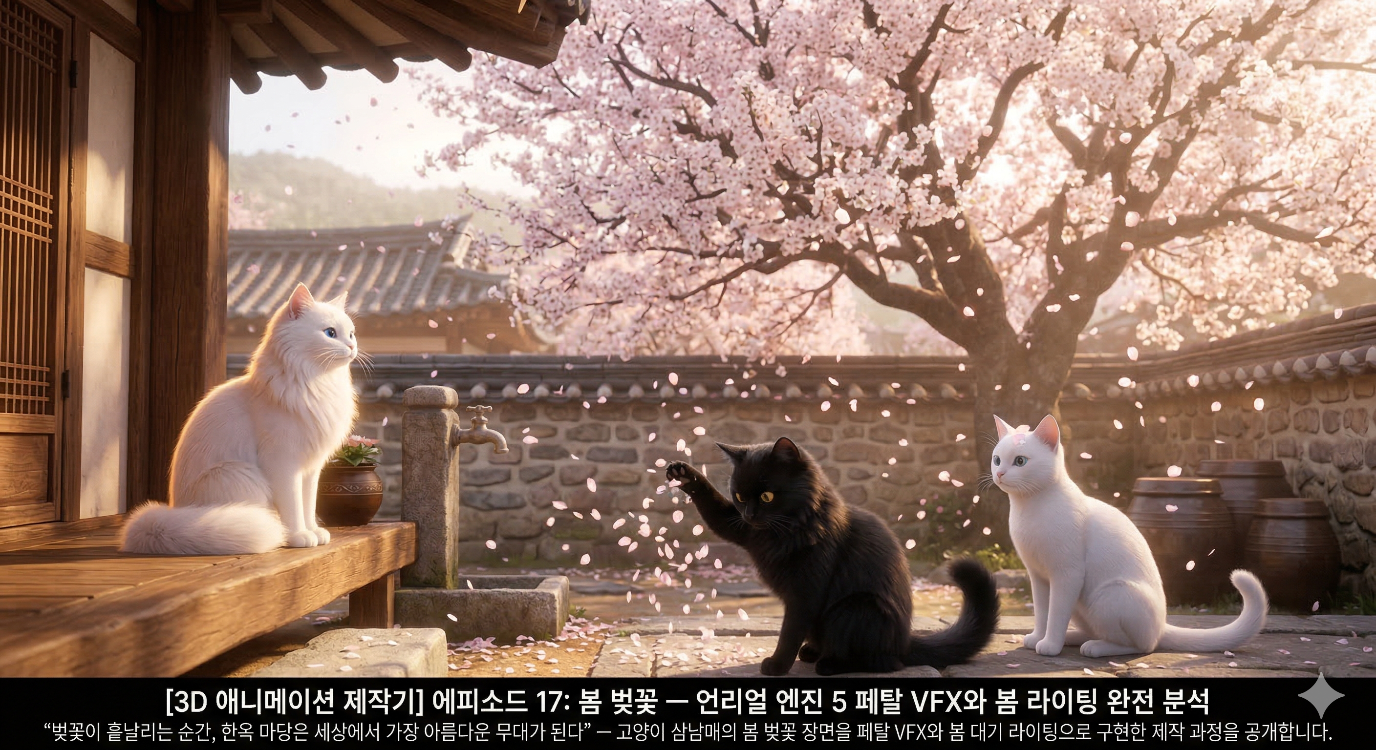 "벚꽃이 흩날리는 순간, 한옥 마당은 세상에서 가장 아름다운 무대가 된다" — 고양이 삼남매의 봄 벚꽃 장면을 페탈 VFX와 봄 대기 라이팅으로 구현한 제작 과정을 공개합니다.