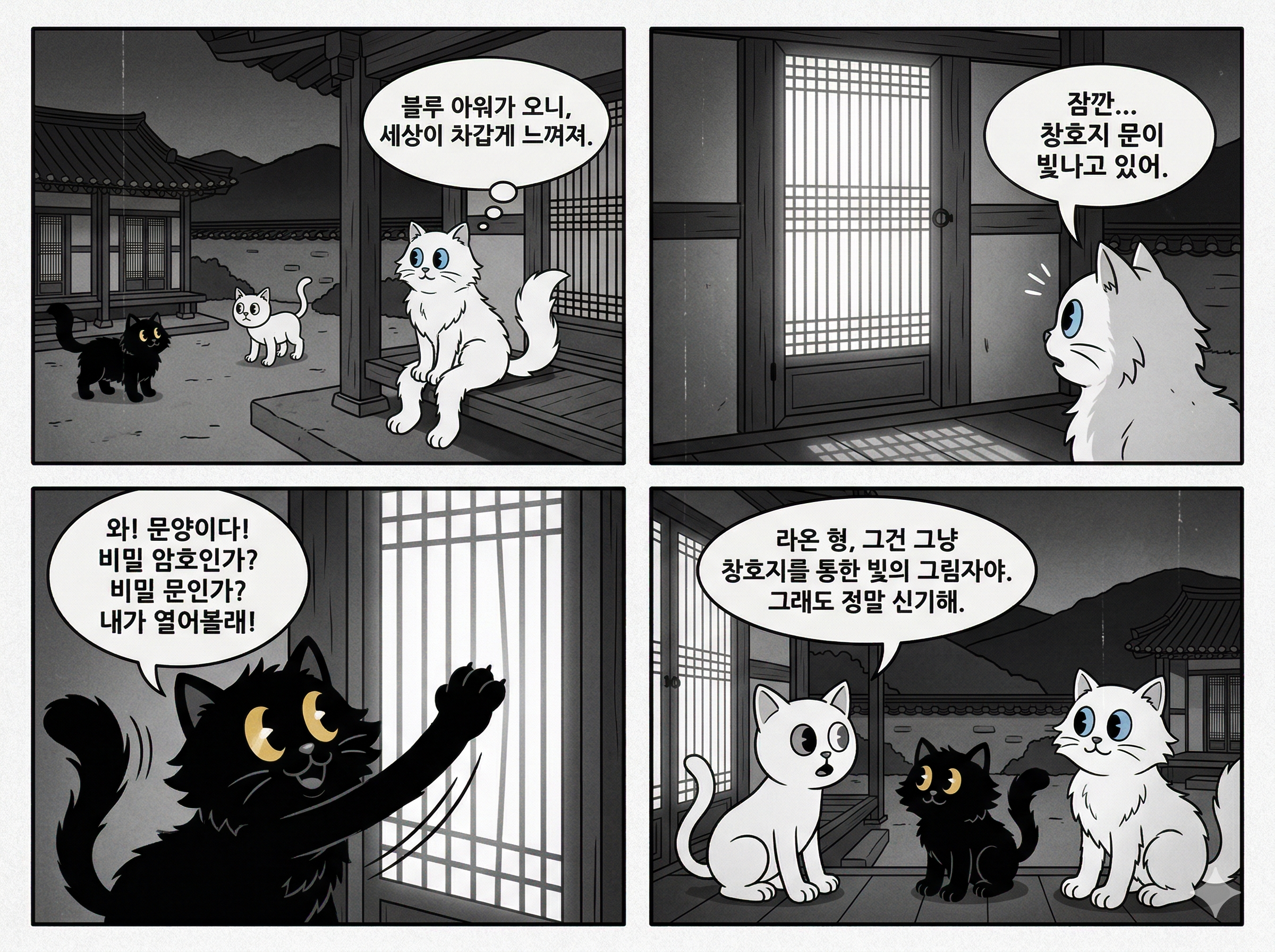 "라온이 형, 그건 창호지를 통해 새어나오는 빛의 그림자야. 그래도 참 신기하긴 해."
