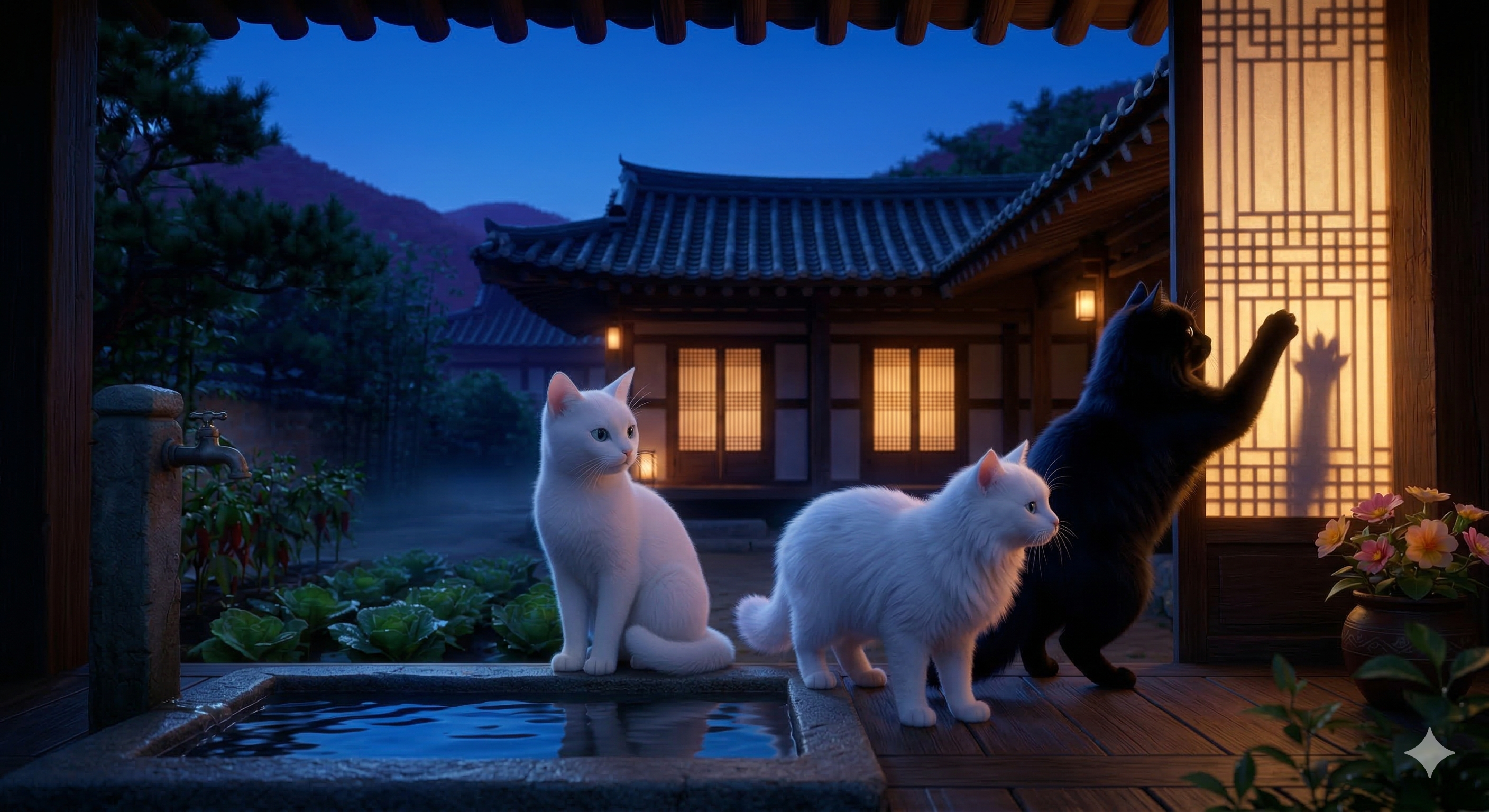 "차가운 블루 아워 속, 창호지 너머로 새어나오는 따뜻한 빛 한 줄기" — 고양이 삼남매의 저녁 장면을 고보 라이트와 SSS 머티리얼로 구현한 제작 과정을 공개합니다.