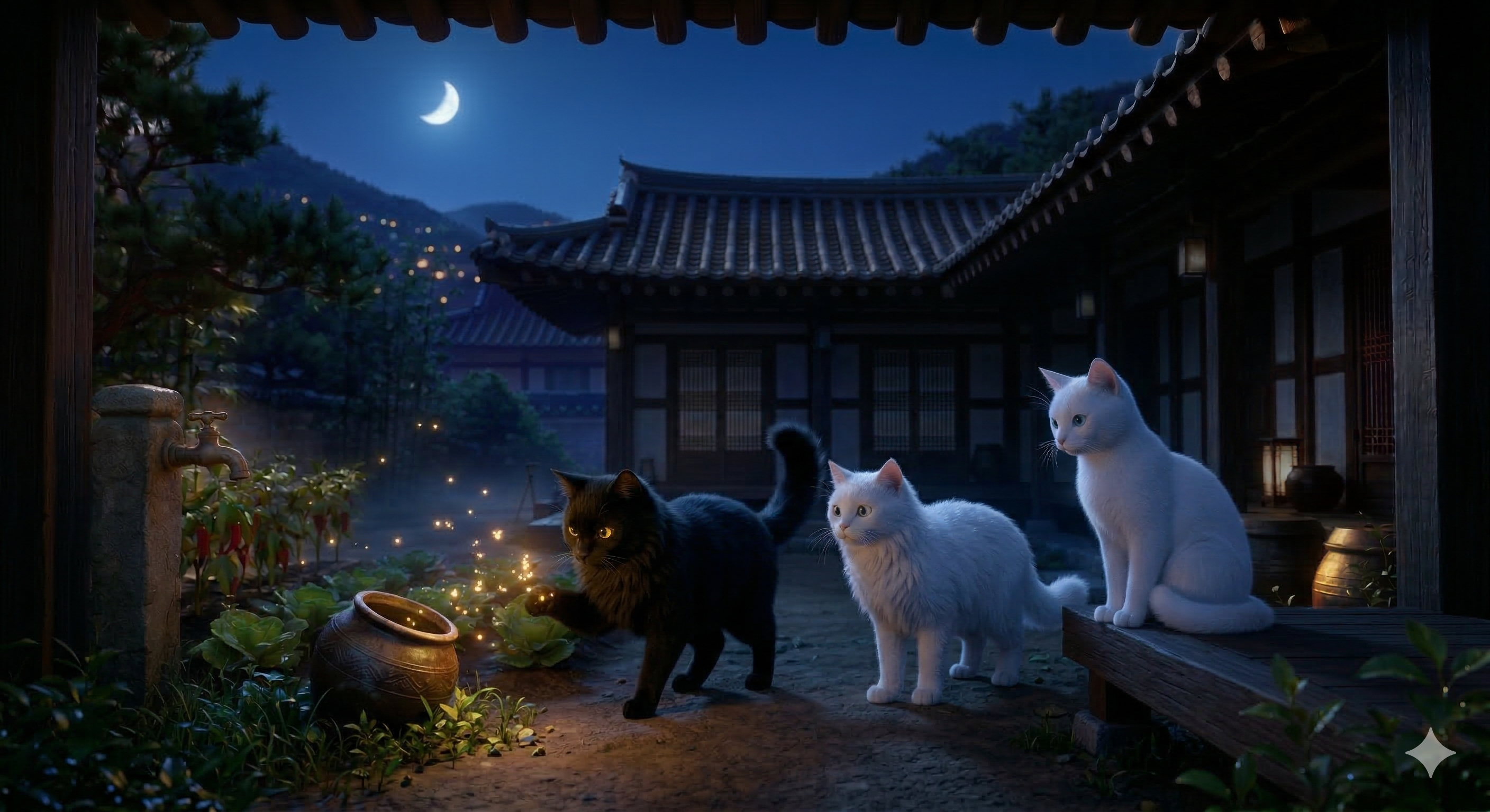 라온(Raon) — 검은 장모, 황금 눈 장독대 옆에서 반딧불이가 흩어지는 빛을 눈을 반짝이며 관찰합니다.