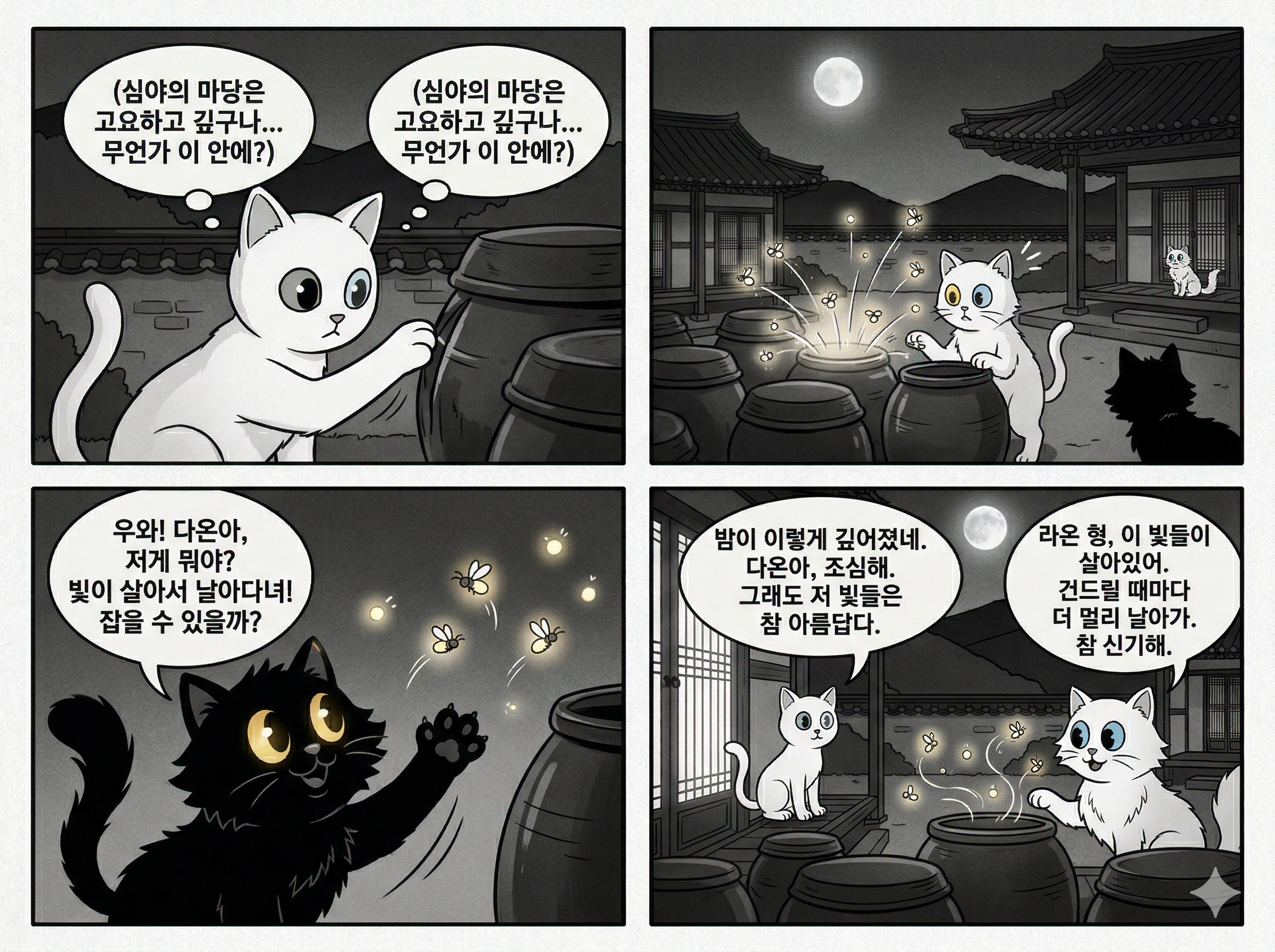 그때, 장독대 사이를 조용히 탐색하던 다온이가 무언가를 발견합니다. 앞발로 살짝 건드리자, 장독대 틈새에서 반딧불이 여러 마리가 흩어져 날아오릅니다.