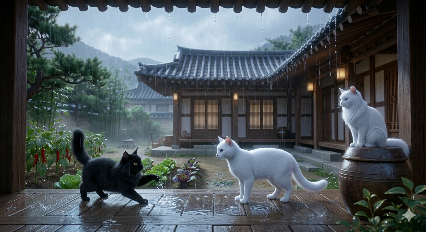 오늘은 분위기를 완전히 바꿔 한옥 마당에 소나기가 내리는 장면으로 넘어갑니다.