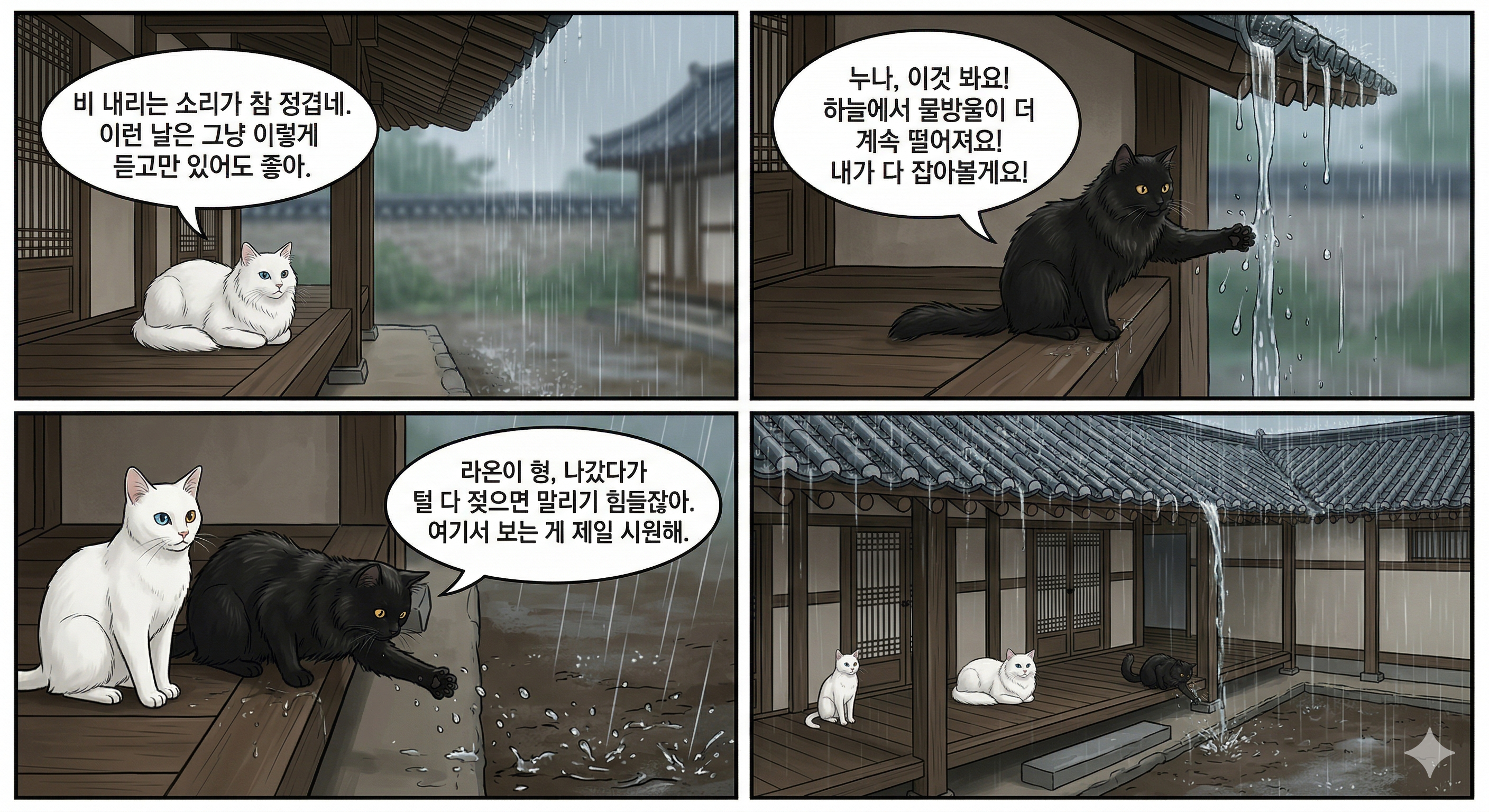 기와지붕을 두드리는 빗소리 속에서 각자의 방식으로 비를 즐기는 루나·라온·다온의 모습이,